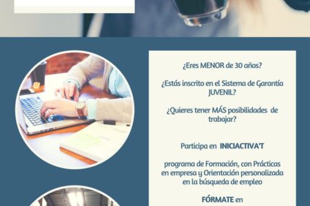 Esta semana se ha abierto el plazo de inscripción para el proyecto de empleo juvenil INICIACTIVA’T, enmarcado dentro del Programa Operativo de Empleo Juvenil (POEJ) financiado con el Fondo Social Europeo. Hasta el día 2 de febrero los jóvenes de Torrent interesados en formar parte de este proyecto de formación podrán formalizar su inscripción a través de la empresa municipal IDEA’T.