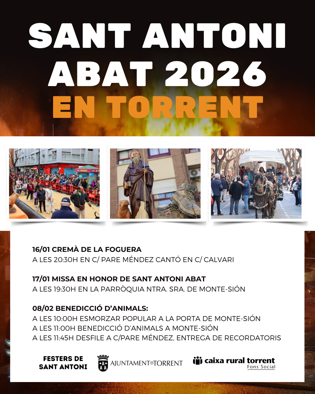 Los actos en honor a Sant Antoni Abat continuarán el sábado 17 de enero, coincidiendo con la festividad del santo, con la celebración de la Misa Mayor a las 19:30 horas en la Parroquia de Nuestra Señora de Monte-Sión.