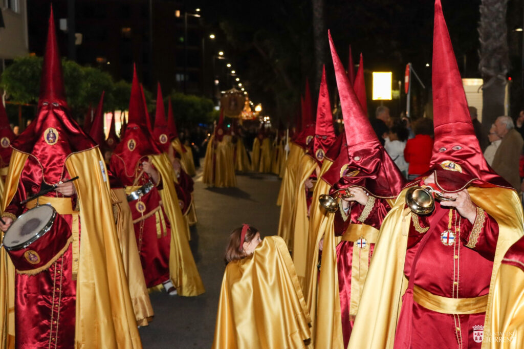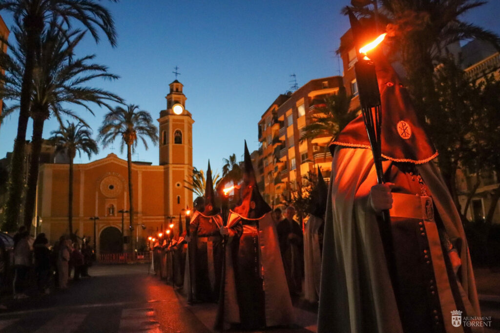 El Miércoles Santo se vivió en la ciudad de Torrent con la pasión característica de esta fecha. La procesión penitencial y representación viviente de las Negaciones de Pedro abrió la programación de la jornada, con un recorrido que se inició en la parroquia de San Luís Bertrán y finalizó en la plaza Moralets, donde el grupo dramático de la hermandad interpretó la reconocida escena. Acto seguido, las hermandades Vera Cruz y Cristo Resucitado, Crucifixión del Señor y Ecce-Homo acompañaron a la hermandad del Cristo de Medinaceli en el traslado del Paso de Jesús de Medinaceli, que finalizó en la parroquia de Monte-Sión.