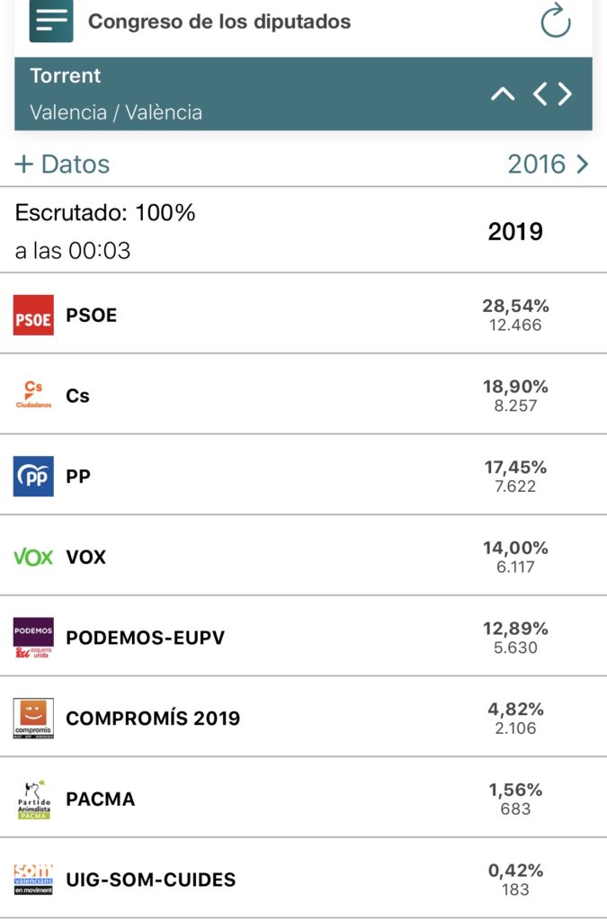 Resultados 28A en Torrent. Elecciones autonómicas