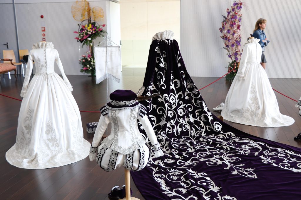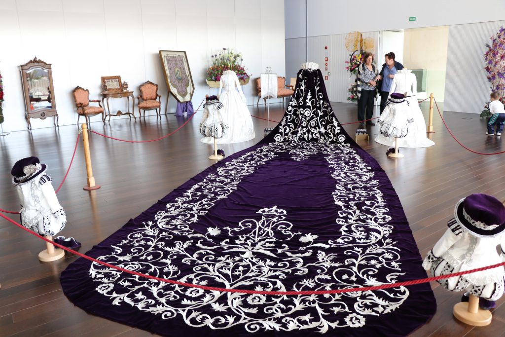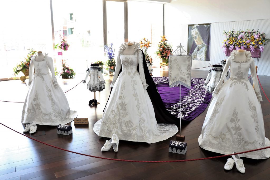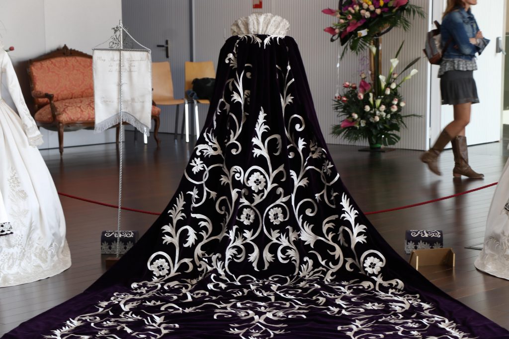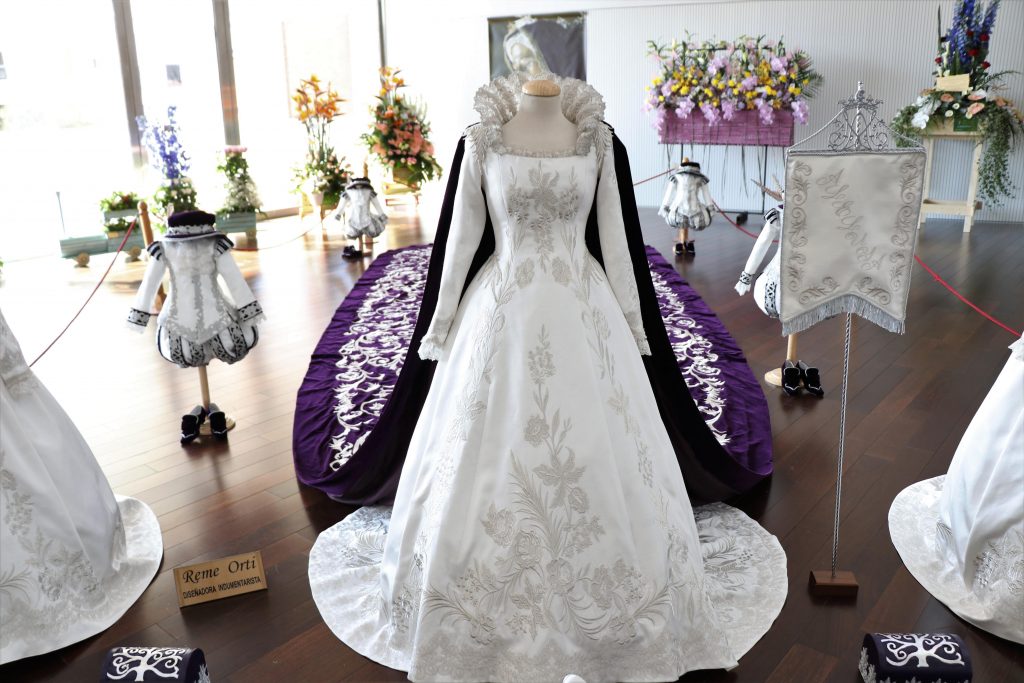 Inspirada en un vestido de reina noruega y una capa que reproduce la que lleva la Virgen el Domingo de Resurrección, ha sido realizado por Reme Ortí.