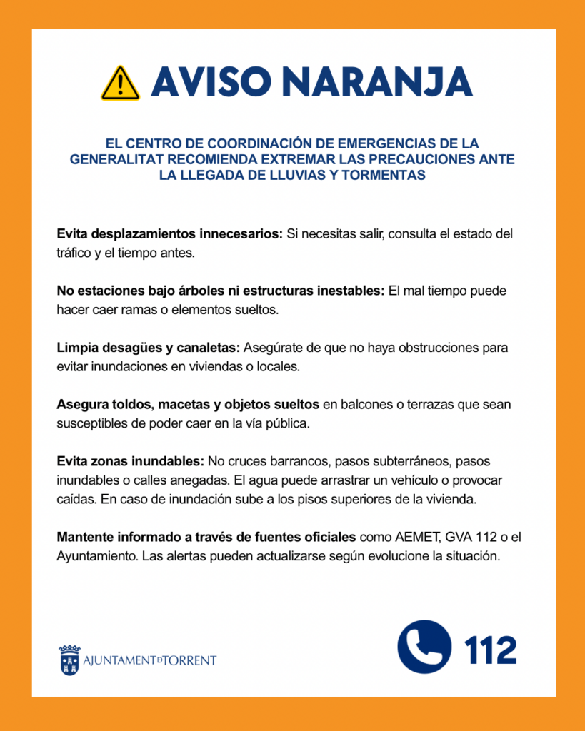 El Ayuntamiento de Torrent ha recordado que viene informando de esta situación desde el día de ayer viernes, momento en el que se anunció oficialmente la alerta naranja para mañana, a través de sus redes sociales, así como mediante los canales municipales de difusión de WhatsApp y Telegram, con el objetivo de que la información llegue de forma rápida y directa a toda la ciudadanía.