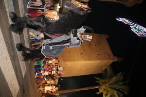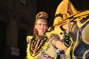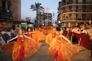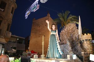 A continuació, les comparses mores van iniciar el seu recorregut que ple de gom a gom va gaudir de cada trage, del moviment dels caporals, de la música i de l’espectacularitat. Fent honor a estos aspectes, la comparsa Beduïns amb repartiment d’obsequis beduïns al públic, balls i les diferents esquadres realenques i guerreres que preludi de la carrossa de Patricia López, alferes mora.