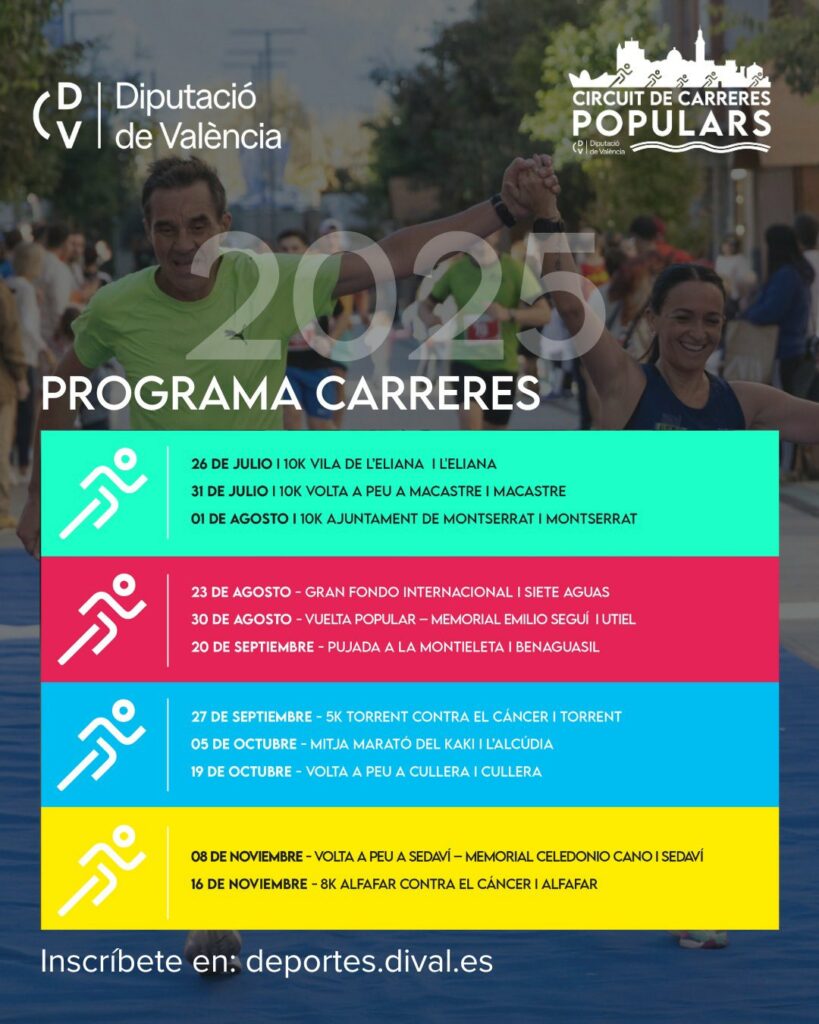 El Circuito de Carreras Populares de la Diputació de València vuelve con una nueva edición que se inicia este sábado 26 de julio con la 10K de l’Eliana. Se trata de la 26ª edición de una competición pionera a nivel nacional, impulsada por el área de Deportes de la corporación, y que este año recorrerá, entre el 26 de julio y el 16 de noviembre, un total de 11 municipios repartidos por toda la provincia de Valencia. El circuito consta de siete pruebas de 10 kilómetros, una de 5 kilómetros, una de 8 km, otra de 15 km y una media maratón.