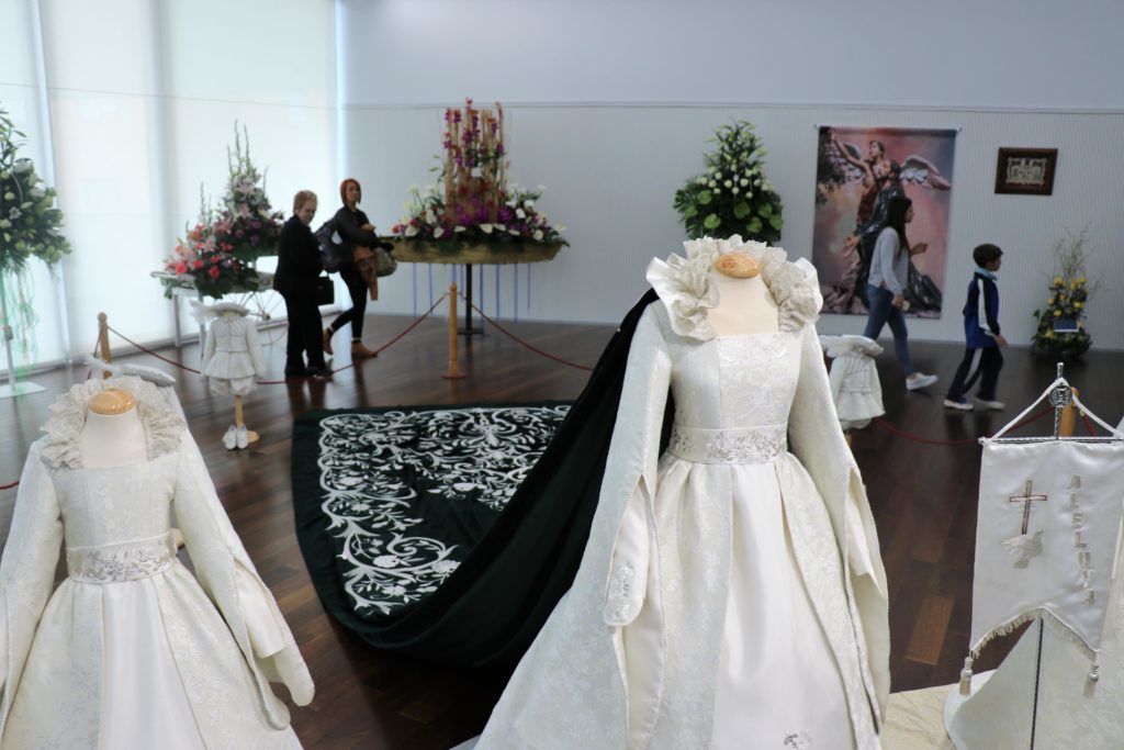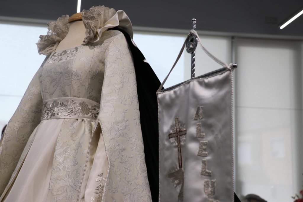 La Reina del Encuentro, María Silla Mora, lucirá el próximo Domingo de Resurrección, un vestido inspirado en la reina Isabel la Católica, con una capa de 6 metros. El vestido con el que María Silla desfilará como Reina del Encuentro y Ángel de Resurrección en el acto culminante de la Semana Santa está elaborado en jacquard, tejido de hilos en metálico en plata, es de color champagne y está bordado con hilo de plata.