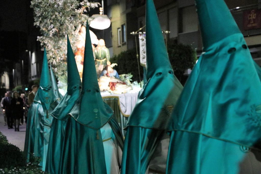 A la medianoche, el protagonismo fue para la hermandad de la Oración del Huerto y su tradicional “procesión de las cadenas”, ya quelos miembros de la hermandad desfilan en silencio portando cadenas. Junto a ellos participó la Reina del Encuentro, María Silla Mora, que pertenece a esta hermandad, junto a sus camareras, Blanca y María, así como el hermano mayor supremo, Francisco Javier Silla Agustí.
