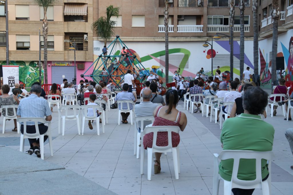 La misma imagen se pudo ver en la plaza Pintor Miró el domingo por la tarde, pero esta vez con la música del Grupo de Cuerda de la Orquesta de la Unión Musical. Bajo la batuta del director Rafael Ortí, los músicos y músicas interpretaron diferentes temas como The Avengers, La La Land, Libertando, Palladio, Assembre The Mininos!, Evenig Shadows, Game of Thrones, Warrior Legacy y Final Countdown. Música a la fresca continuará el próximo fin de semana. En esta ocasión, el sábado 25 a las 20.30 h será el turno para el Grupo de Cámara del Círculo Católico en la plaza Pintor Miró. Y a la misma hora, pero el domingo 26, le seguirá el Grupo de Saxofones y Grupo de Metales de la Unión Musical.