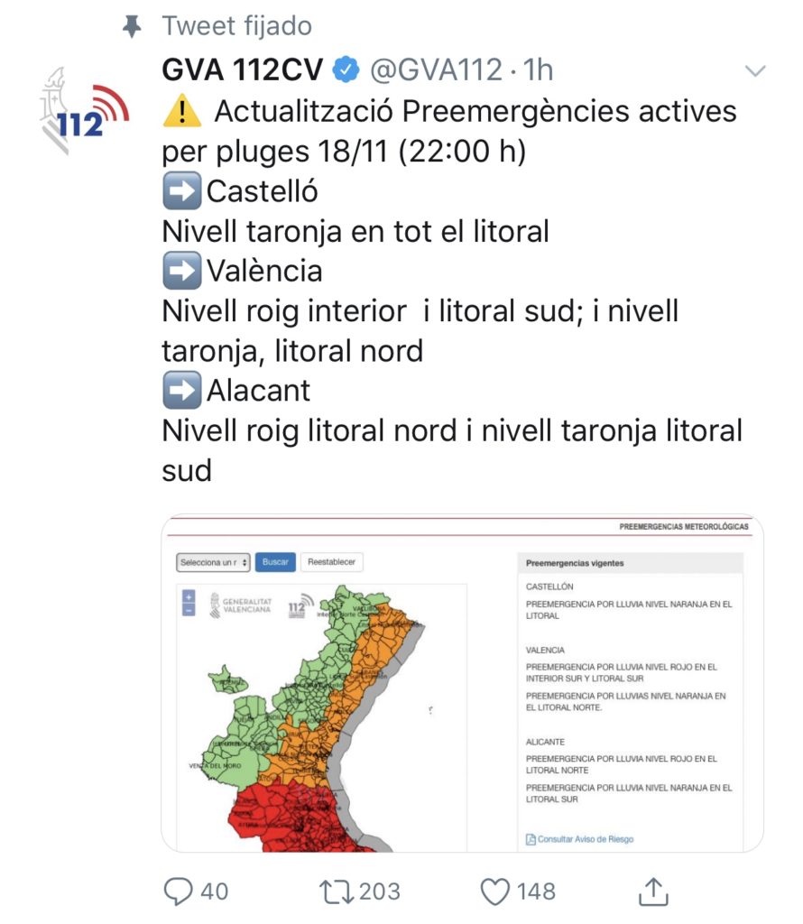 El nivel de preemergencia para el litoral norte de la provincia de Valencia pasa a ser naranja, según han comunicado a través de Twitter, desde el 112 de la Generalitat a las 22h.