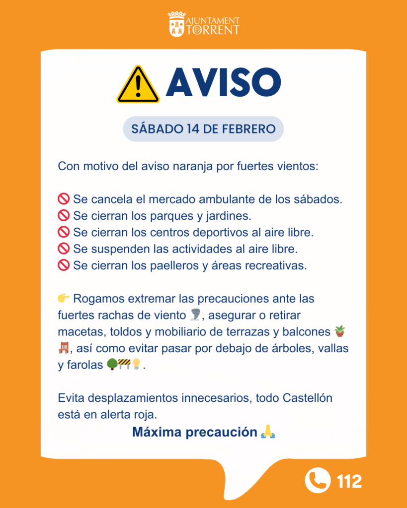 El Ayuntamiento de Torrent ha anunciado una serie de medidas preventivas ante la alerta naranja por fuertes vientos activada por la AEMET para mañana sábado, 14 de febrero, en el litoral norte de la provincia de Valencia.