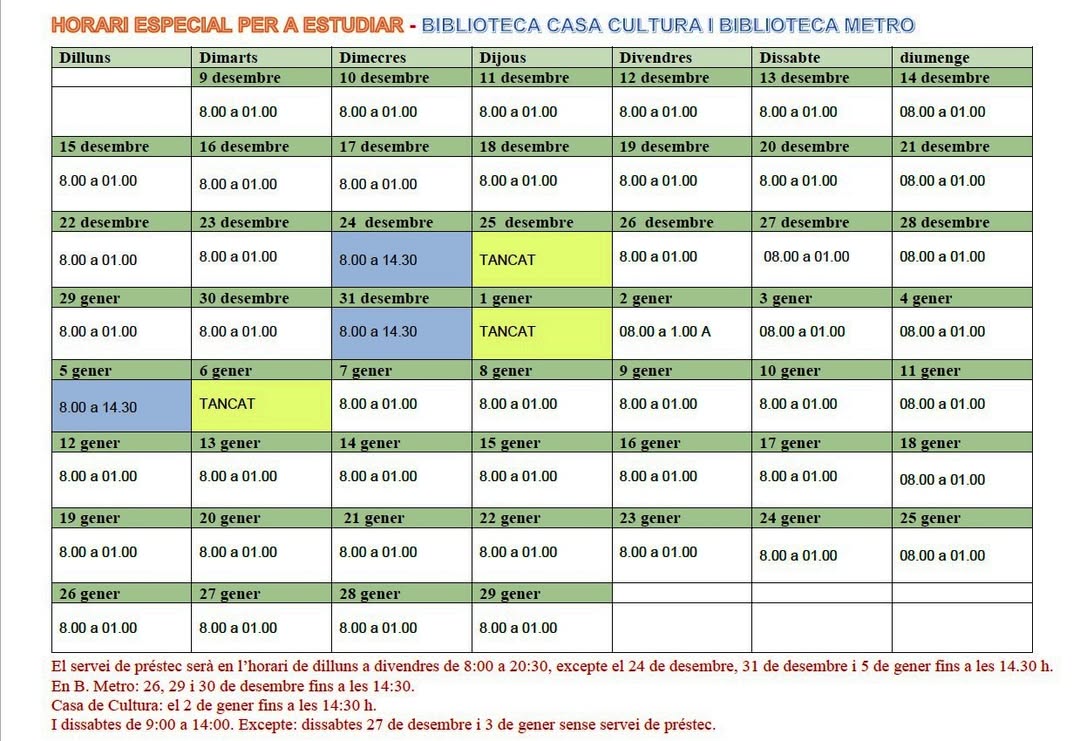 Además, el servicio de préstamo de libros funcionará de lunes a viernes de 8:00 a 20:30horas, excepto el 24 y 31 de diciembre y el 5 de enero que será hasta las 14:30 horas, en la Biblioteca Metro, el 26, 29 y 30 hasta las 14,30 horas. Y en la Biblioteca de la Casa de la Cultura, el 2 de enero hasta las 14,30 horas. El ayuntamiento informa que los usuarios podrán devolver libros en cualquier momento del día mediante los buzones 24 horas instalados tanto en la Biblioteca Metro como en la Casa de la Cultura.