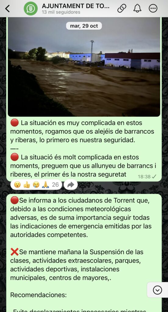 El 29 de octubre, día de la riada que dejó inundaciones significativas en Torrent, el Ayuntamiento intensificó su labor de comunicación. A las 12:15 del mediodía, se lanzó un aviso urgente a través del WhatsApp municipal para informar sobre medidas preventivas como la suspensión de clases, el cierre de pasos inundables y parques, y la cancelación de todas las actividades municipales. Este mensaje fue difundido también a través de las redes sociales oficiales del consistorio: Facebook, con 25.000 seguidores, e Instagram, que cuenta con casi 19.000, además de informar a través de los medios de comunicación. La ciudad de Torrent fue de las primeras en avisar el fatídico día a su población.