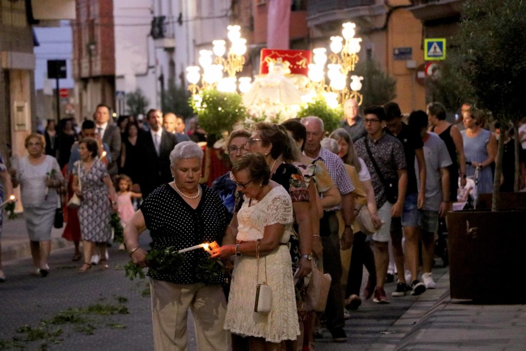 Más tarde, la celebración continuó con una procesión por el casco antiguo, en un itinerario por las calles engalanadas para la ocasión con mantos bordados en los balcones, donde el paso y a las clavariesas fueron acompañados con el silencio de los asistentes y con diversos cánticos. El acto finalizó con un castillo en honor a la Virgen a los pies de la Torre.