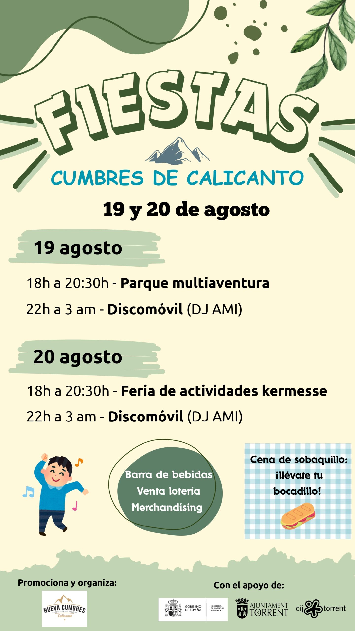Por su parte, la Asociación Nueva Cumbres invita a participar en las Fiestas de Cumbres de Calicanto, que se desarrollarán los días 19 y 20 de agosto en la calle Lluna, 55 (frente al antiguo Polideportivo). El martes 19, de 18:00 a 20:30 horas, los más aventureros, hasta 12 años, podrán disfrutar del Parque Multiaventura. A las 21:00 horas, una pausa para cenar de sobaquillo, mientras que la jornada concluirá con una Discomóvil (DJ AMI, vecino de la urbanización) desde las 22:00 hasta las 03:00 horas. El miércoles 20, la fiesta continuará con una feria de actividades kermesse (globoflexia, horchata, palomitas, juegos y más), también en horario de 18:00 a 20:30 horas, y nuevamente la música pondrá el broche de oro a la velada con una animada discomóvil, que comenzará a las 22:00 a las 3:00 horas. Durante ambas jornadas habrá barra de bebidas, venta de lotería, merchandising exclusivo, camisetas y abanicos diseñados especialmente, y cena de “sobaquillo”, donde cada asistente podrá llevar su propio bocadillo para compartir unas noches de convivencia vecinal.