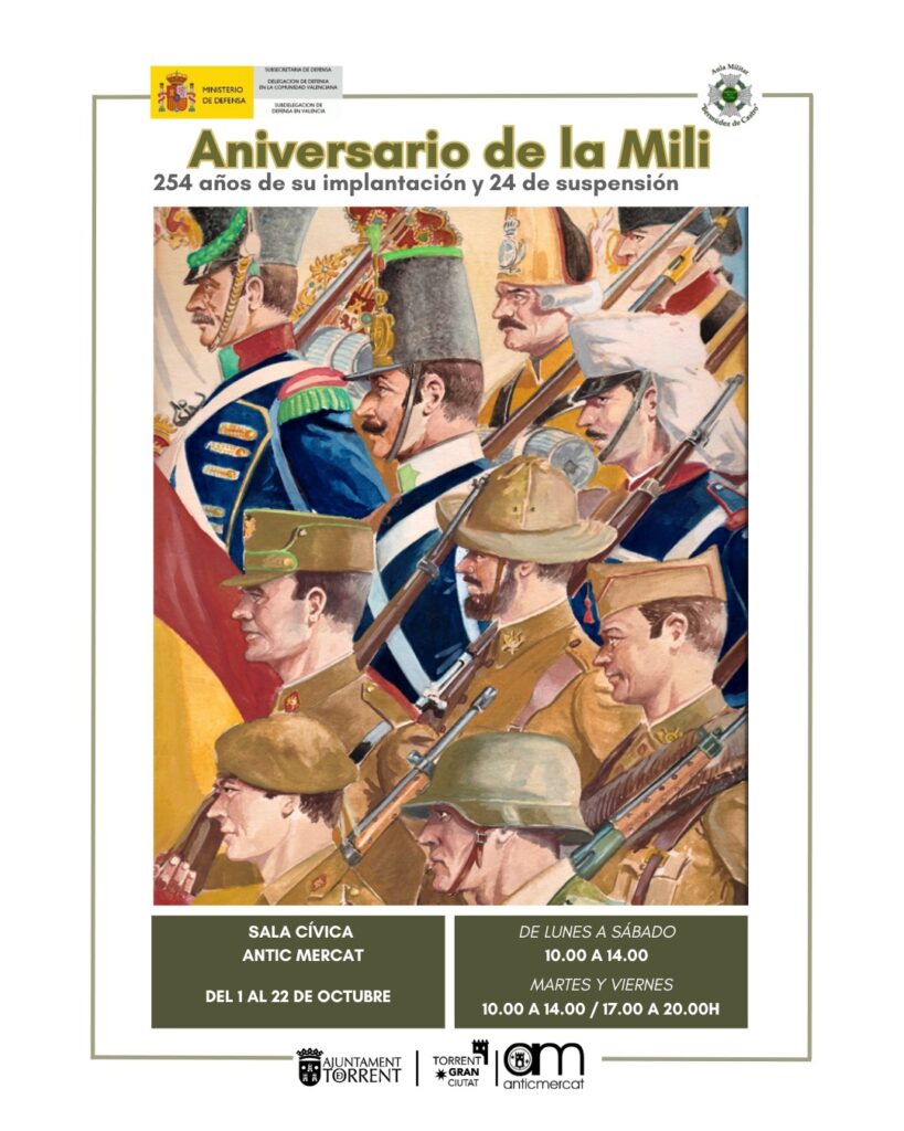 La misma sala cívica del Antic Mercat acoge hasta el mismo 22 de octubre la exposición “Aniversario de la Mili: 254 años de su implantación y 24 de suspensión”, organizada por el Ministerio de Defensa con la colaboración del Ayuntamiento de Torrent, un recorrido por 230 años de historia del servicio militar en España.