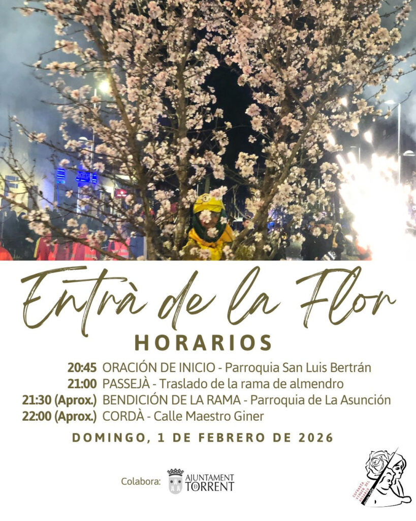 El domingo 1 de febrero tendrá lugar uno de los actos centrales del calendario festivo torrentino: l’Entrà de la Flor, una tradición con más de 400 años de historia, en la que los clavarios de la Virgen del Rosario y los participantes ofrecen a la imagen mariana la primera flor del almendro de la temporada, en un gesto cargado de simbolismo para la ciudad.