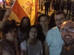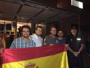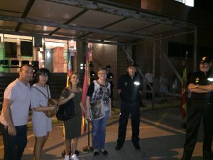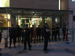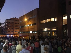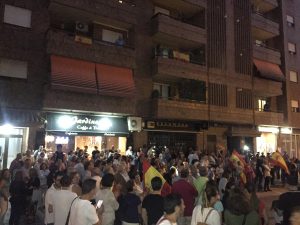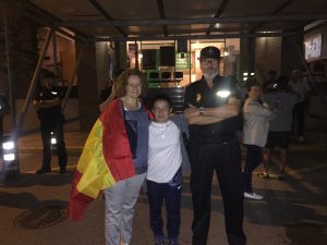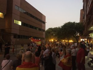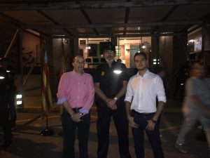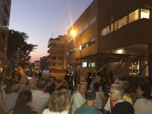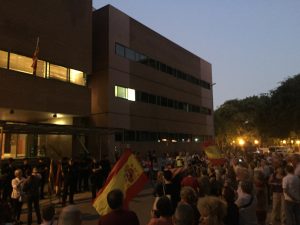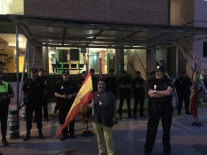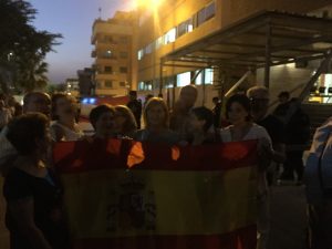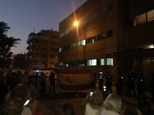 La cita de los vecinos prevista para las 20 horas se adelantó al salir los agentes de Torrent con su comisario al frente y colocar las banderas institucionales en la puerta de la comisaría. Momento que los asistentes rompieron a aplaudirles y continuar al grito de ‘No estáis solos’, ‘somos españoles’, ‘Viva la Policía y Viva la Guardia Civil’ y vivas a España.