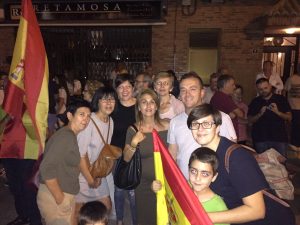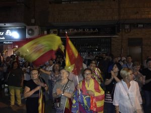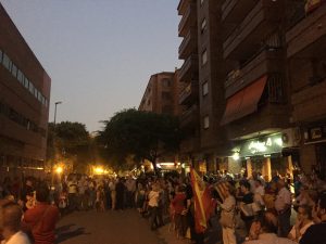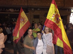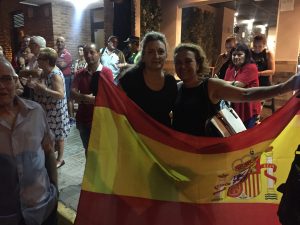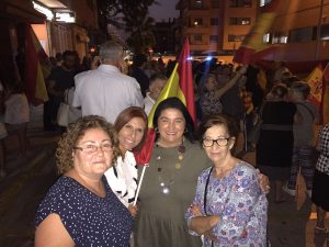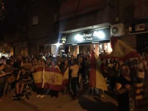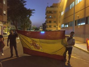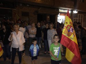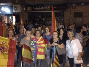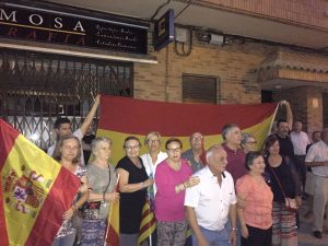 Banderas españolas y Senyeres Valencianas fueron portadas por los asistentes, mientras que dos vecinos desplegaron una gran bandera de España.