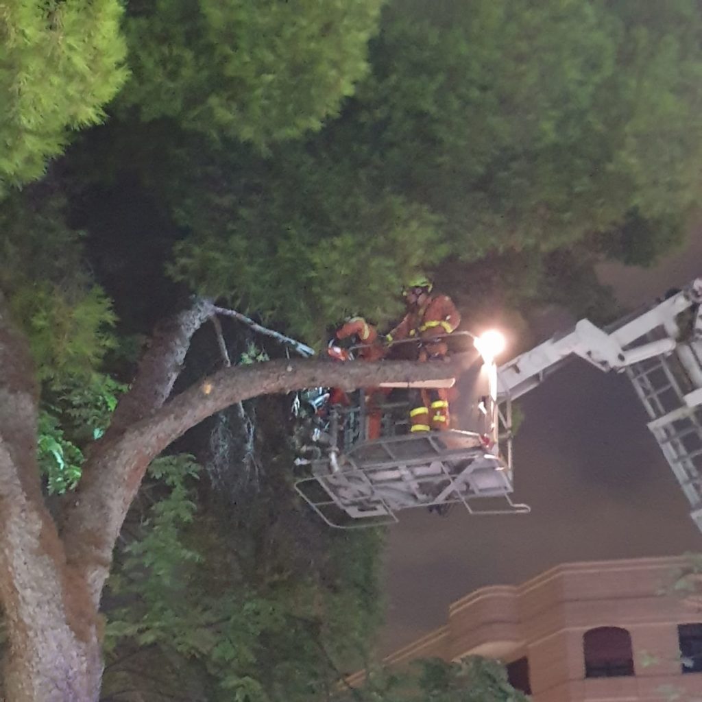 Hasta la zona se desplazaron desde el Consorcio provincial de Bomberos y la Policía Local, así como numerosos vecinos que observaron los trabajos de poda y cortado de la gran rama que amenazaba a los viandantes.